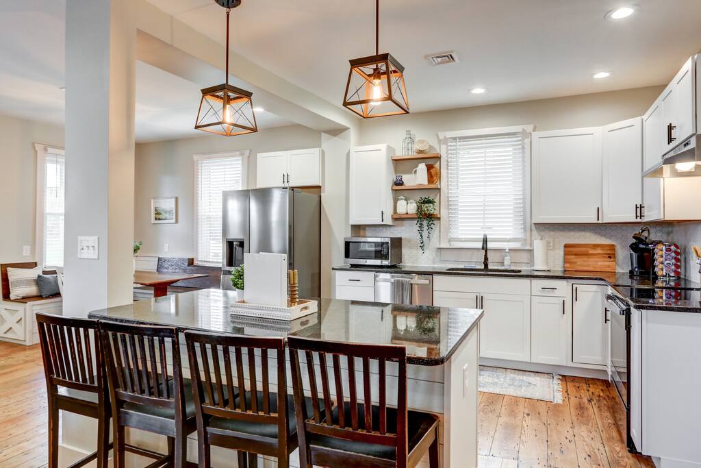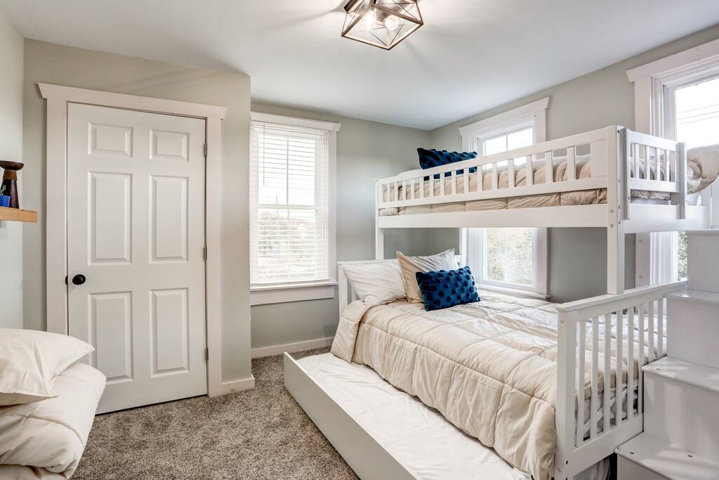 Main floor: - Large living room with pullout sofa - Fully stocked kitchen with island seating - Breakfast nook - Dining room with seating for 8 - Half bathroom - Laundry room with washer and dryer 2nd floor: Master Bedroom - King bed and attached private full bathroom with shower 2nd Bedroom - Queen Bed 3rd Bedroom - Full/twin bunk bed with twin trundle bed Full bathroom with shower/tub