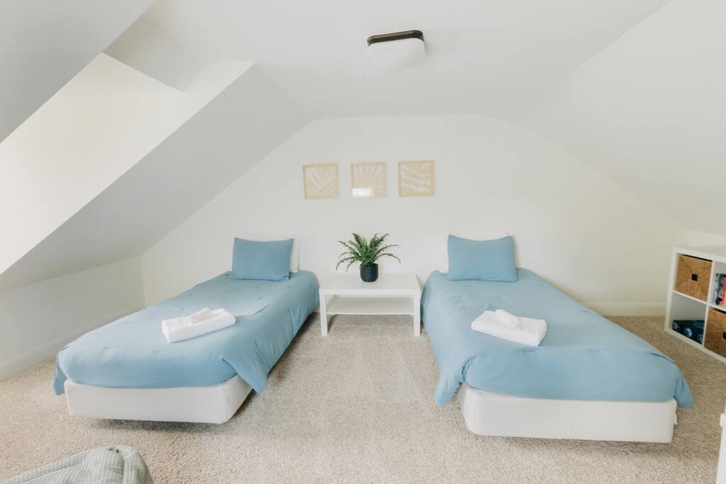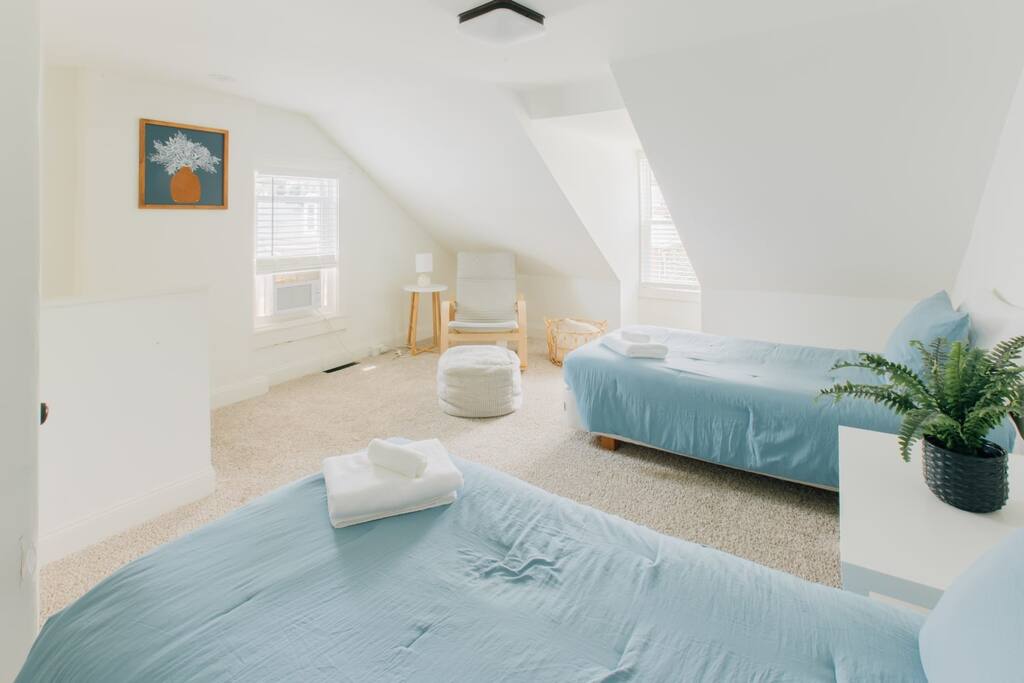 Main floor: - Living room with HD TV - Well equipped kitchen with island seating - Dining room with seating for 6 - Half bath 2nd floor: Bedroom 1 - Queen bed Bedroom 2 - Queen bed Full bathroom with shower/tub Laundry closet with washer/dryer 3rd floor: Bedroom 3 - Two twin beds