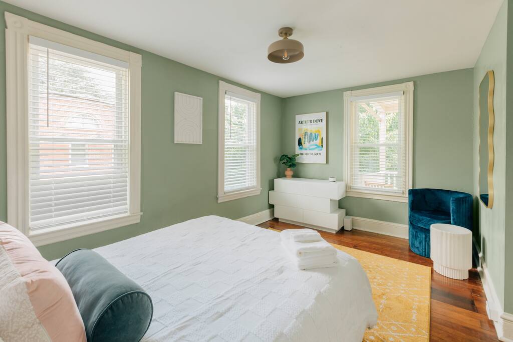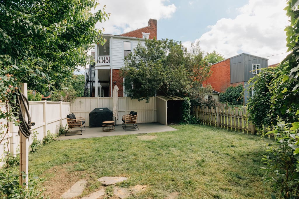 Main floor: - Spacious living room with a 55" TV - Dining room with seating for 6 - Well appointed kitchen with gas range and dishwasher - Half bathroom 2nd floor: - Bedroom 1: Queen bed - Bedroom 2: Queen bed with attached balcony - Bedroom 3: Small bedroom with twin bed - Full bathroom with shower/tub Outdoor space with a gas grill and patio seating